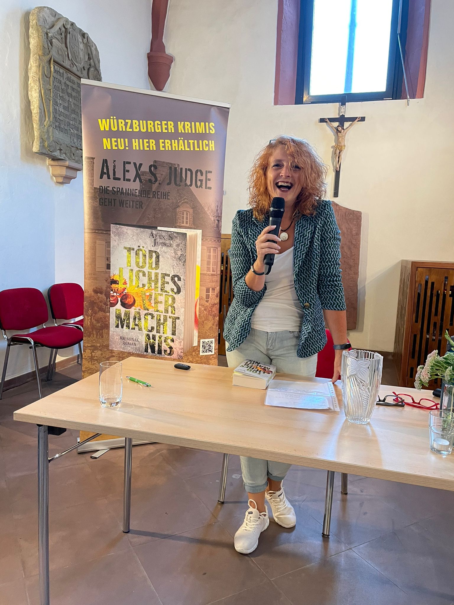 Bevor die Autorin mit Ihrer rund 1,5 stündigen Lesung begann erzählte Sie ein wenig aus Ihrem Leben. Das Sie "im Osten aufgewachsen" ist und jetzt in Karlstadt lebt, dass Sie "immer gerne geschrieben" habe und sich mit Ihrer Erstveröffentlichung "Tödliche Abgründe" im Jahre 2016 lediglich selbst die Frage beantworten wollte, ob Sie es wohl schaffen würde, jemals ein Buch zu schreiben. Auch wie Sie zu Ihrem Autorennamen kam hat Alex S.Judge dem Publikum verraten.