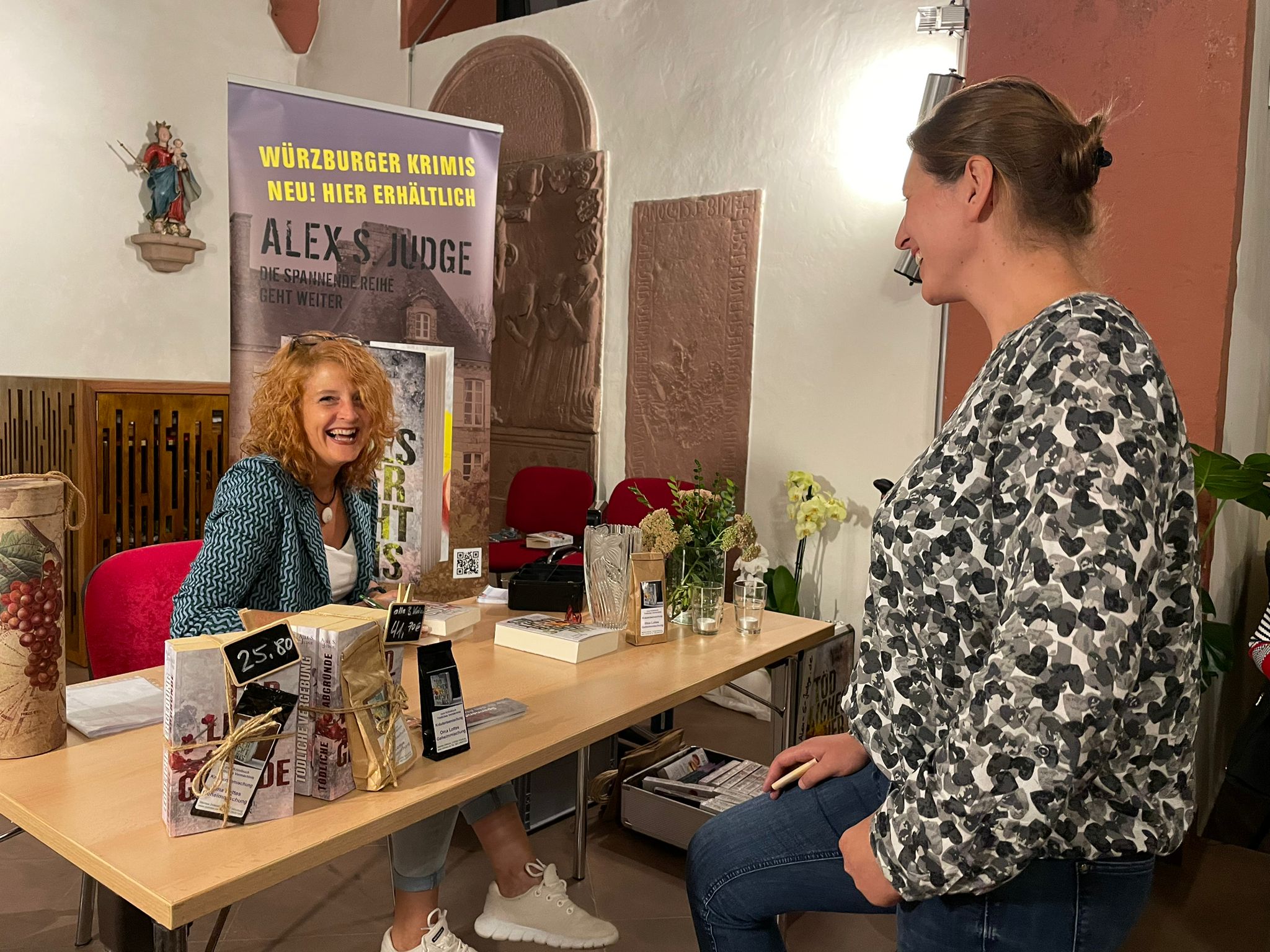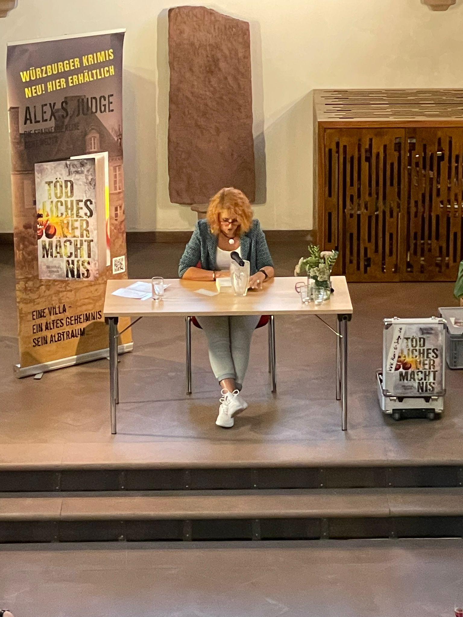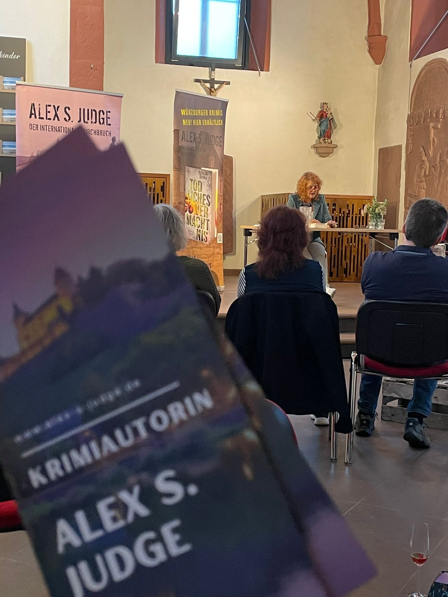 Die Autorin las verschiedene Stellen Ihres Kriminalromans vor und änderte je nach Bedarf Ihre Stimme. Es war spürbar, dass es Ihr beim Vorlesen um Spannung und Lesevergnügen geht. Im Anschluss an die Lesung beantwortete Alex S.Judge Fragen aus dem Publikum, bevor Sie in die erworbenen Bücher Widmungen schrieb. Die individuellen Worte werden an den sehr persönlichen Literaturabend in Wernfeld immer gerne erinnern.
