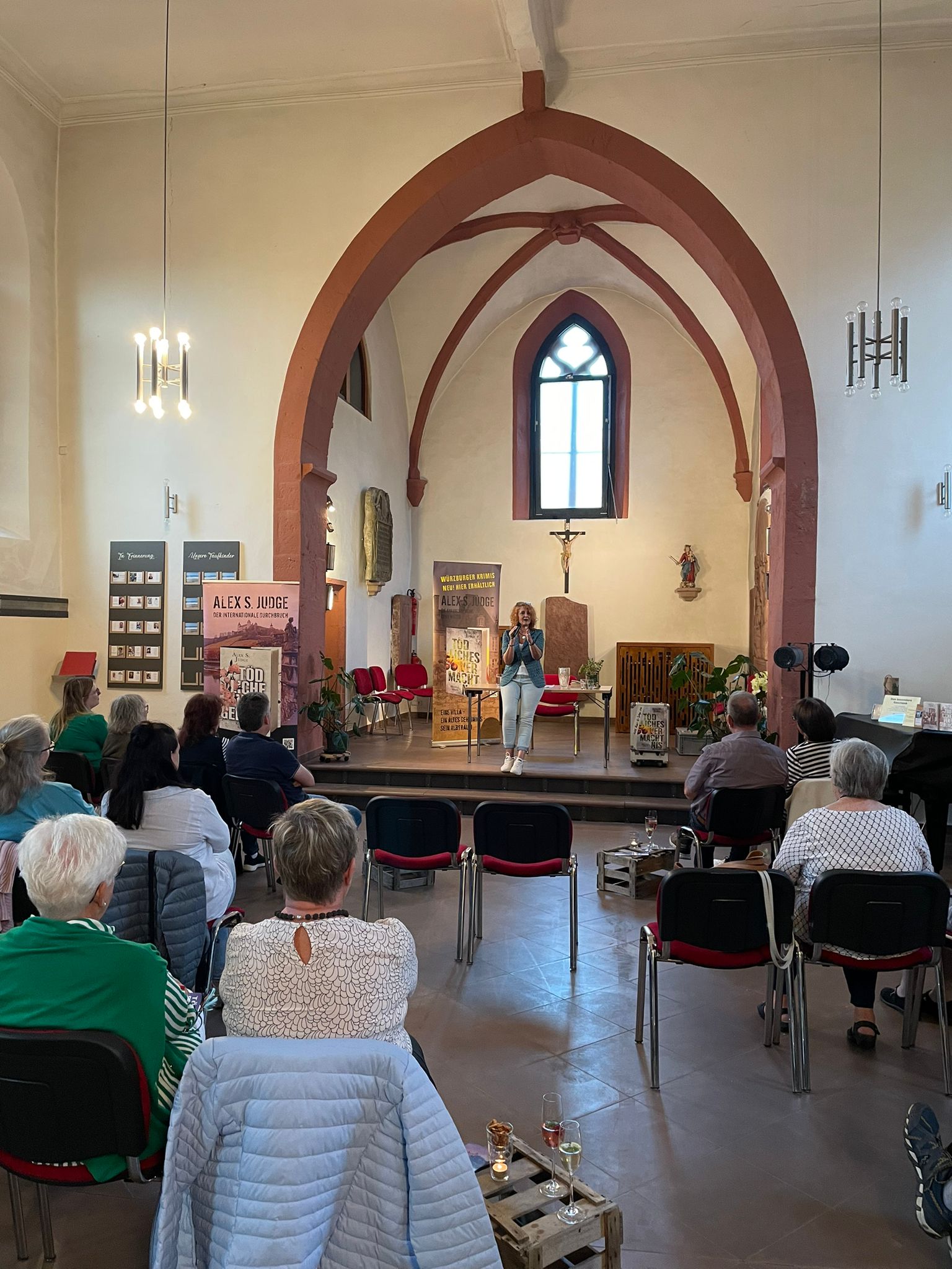 "Tödliches Vermächtnis"-ein spannungsgeladener Kriminalroman von Alex S.Judge, welcher bereits das 3. Band der aus Karlstadt stammenden Autorin ist. Als Handlungsort wählte Sie das idyllische Dörfchen Margetshöchheim. Zum 55.jährigen Jubiläum hat die Bücherei Wernfeld zu dieser Lesung in die Alte Kirche Wernfeld eingeladen und durfte rund 25 Zuhörer begrüßen.